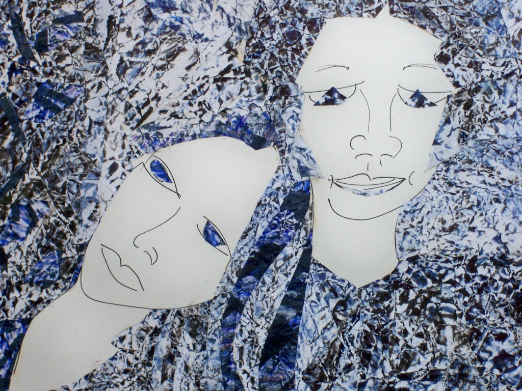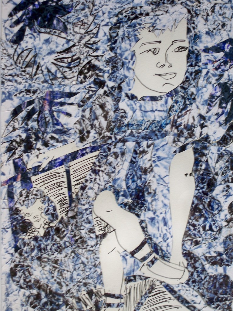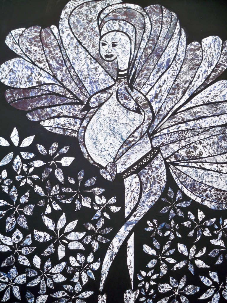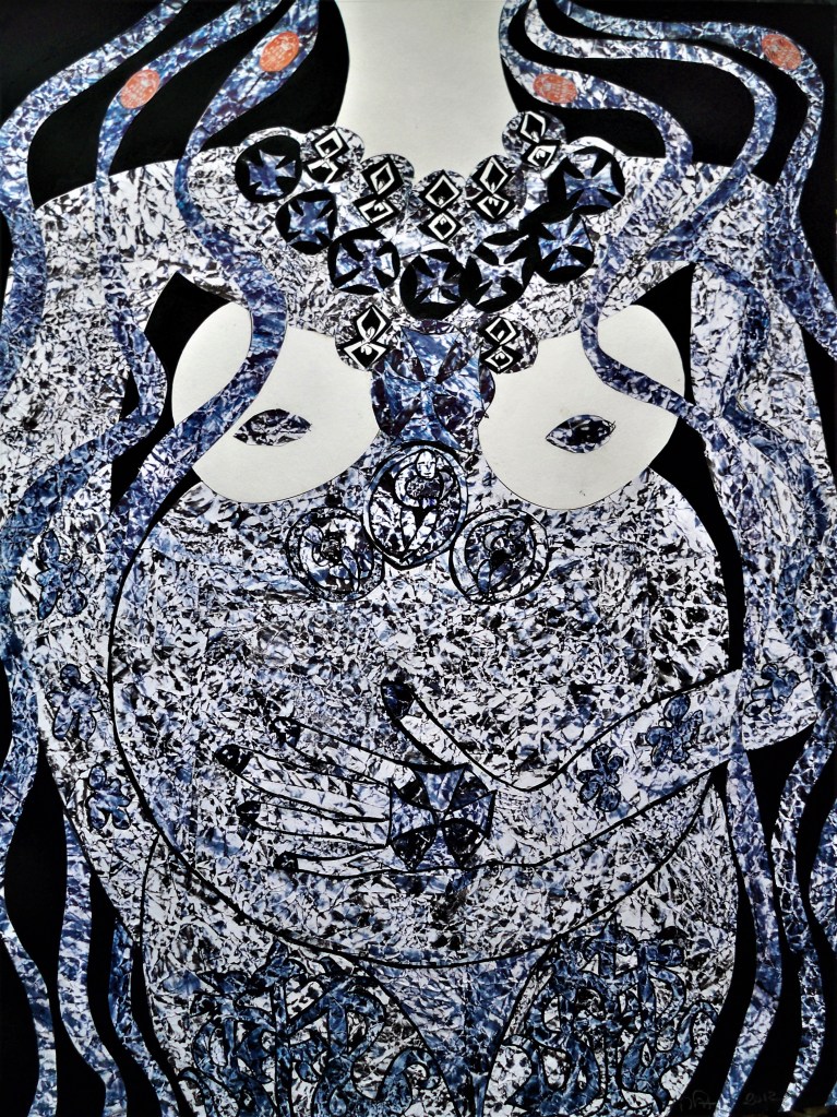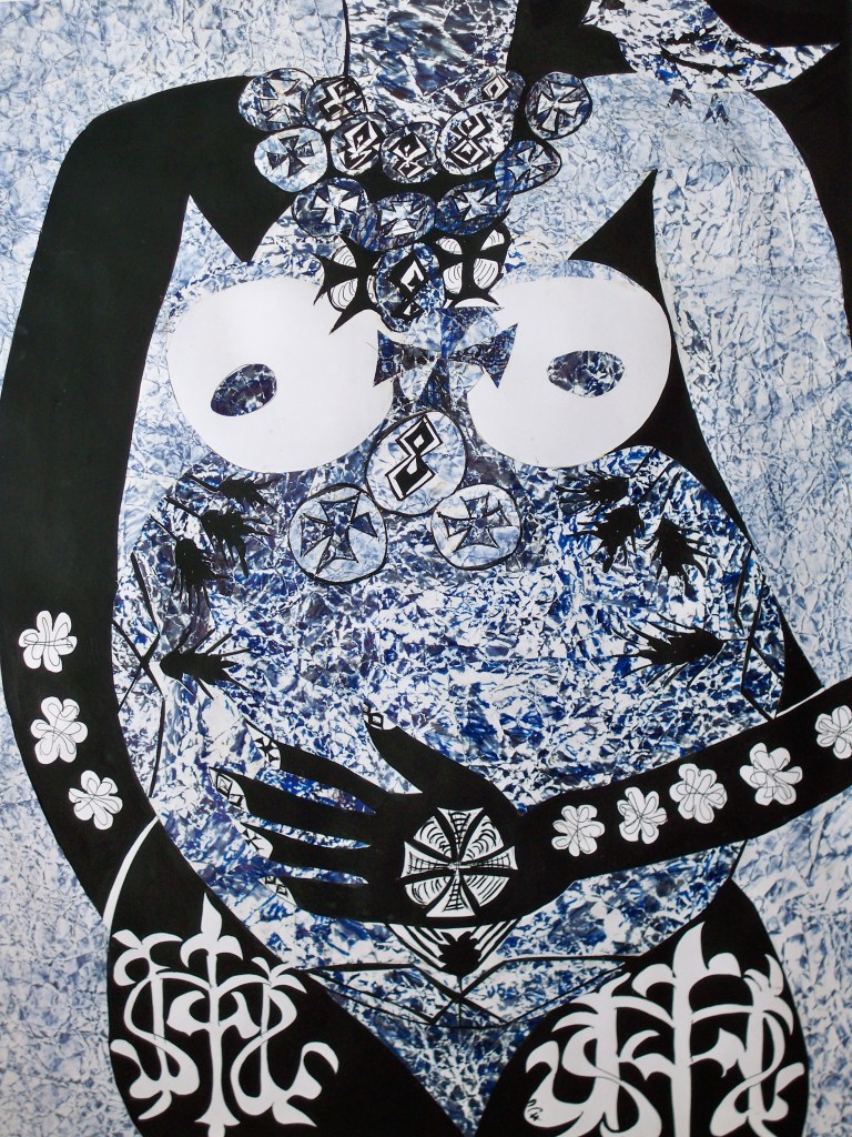 Collages sur papier et gouache, les six premiers sont de format 30/40. Les maternités sont au format raisin, 50/65cm. Ils datent de 2011 à 2014.